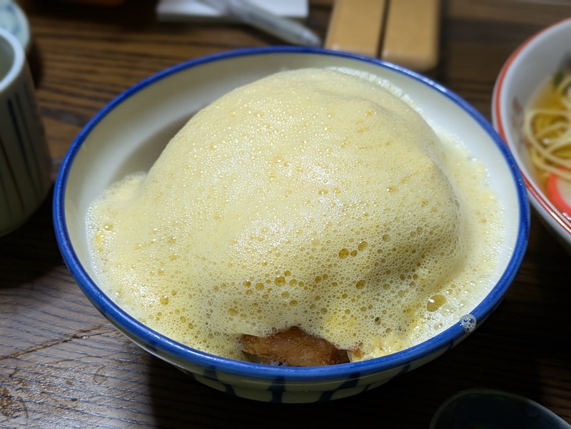 この泡状の卵には、断熱効果・旨味の保持・食感のコントラストという3つの機能が備わっており、カツのサクサクとした衣と弾力ある豚肉、シュワッと溶ける卵が一つの器の中で見事に調和します。