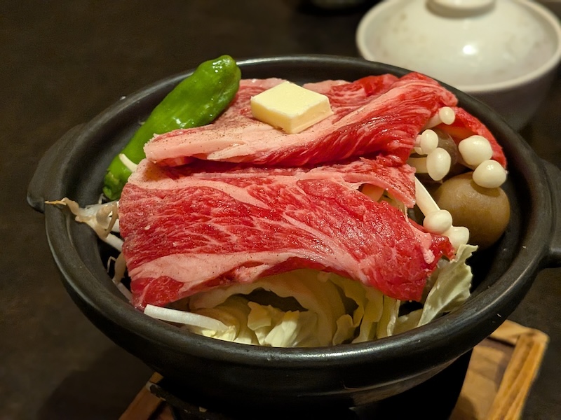 丁寧に仕立てられた出汁の中で、サシの入った和牛がゆっくりと火を通され、一口食べると脂の甘みが口中に広がります。