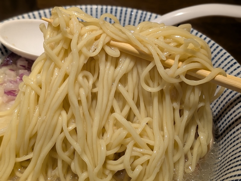 麺は細めのストレート。しなやかでやや低加水寄りの質感ですが、表面のざらつきが絶妙にスープを持ち上げます。