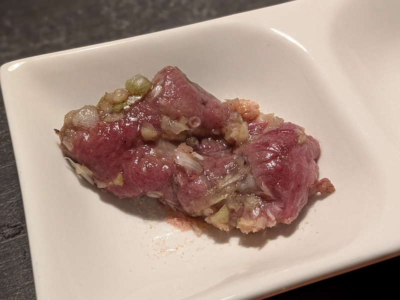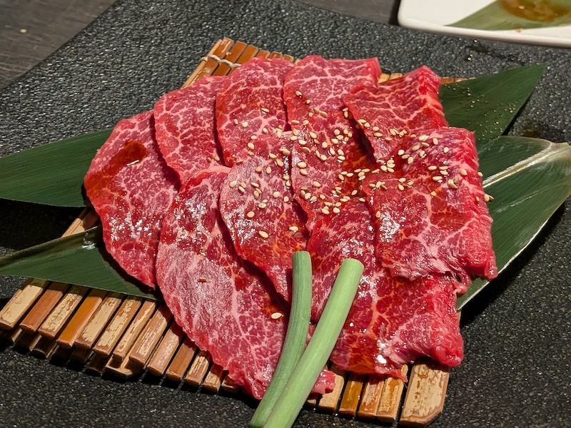 続いてオーダーしたのは、希少部位の「ミスジ」と「カイノミ」。整然と並べられた断面には、きめ細やかな霜降りが美しい大理石模様を描いており、その佇まいだけで素材の質の高さが伝わってきます。