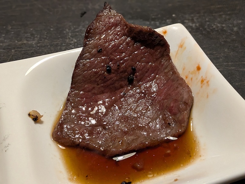 炭火でさっと炙り、わさびを添えていただくと、口の中でとろけるような柔らかさとともに、凝縮された肉の旨味がゆっくりと広がります。
