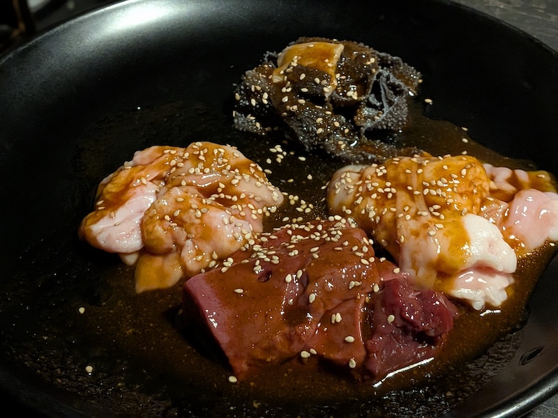 さらに、ホルモンの盛り合わせも堪能しました。上ミノ・ホルモン・ツラミといった個性豊かな内臓が一皿に集結しており、上ミノのコリコリとした心地よい歯ごたえを楽しんでいると、内臓特有のクリーミーな脂の旨味がじわりと溶け出してきます。