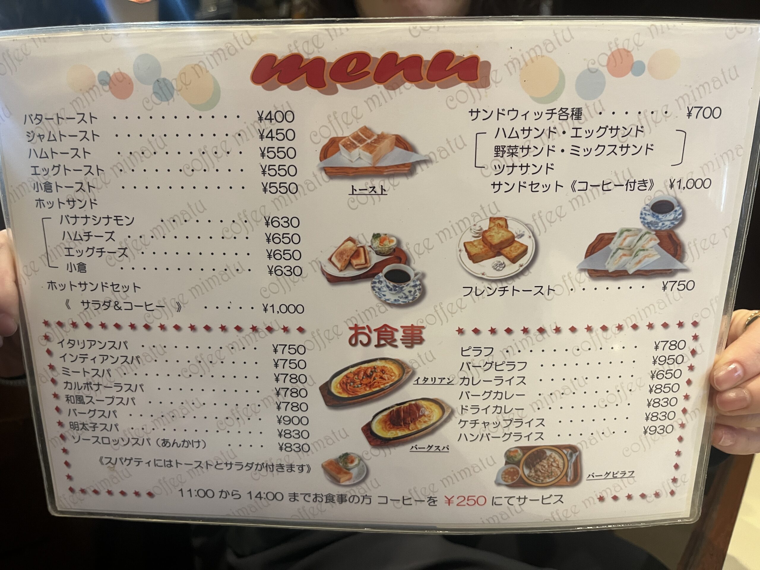 そのほかにも、ピラフやサンドウィッチ、カレー、明太子スパゲッティなど、喫茶店らしいメニューが豊富に揃っています。