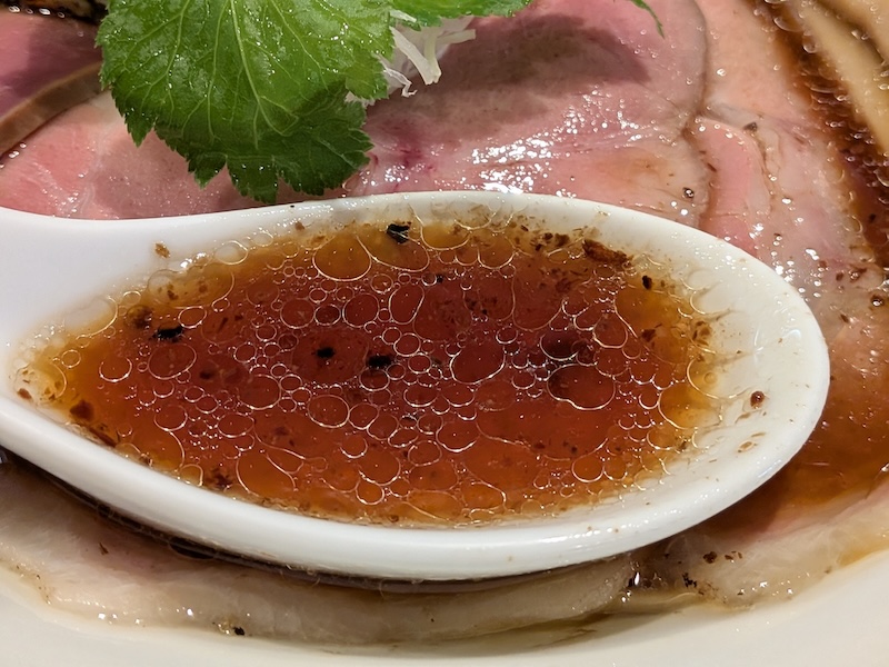 表面に薄く張った鶏脂の膜が照明を受けてきらりと輝き、その奥にある清澄なスープの金色がじっくりと目に映り込んできます。