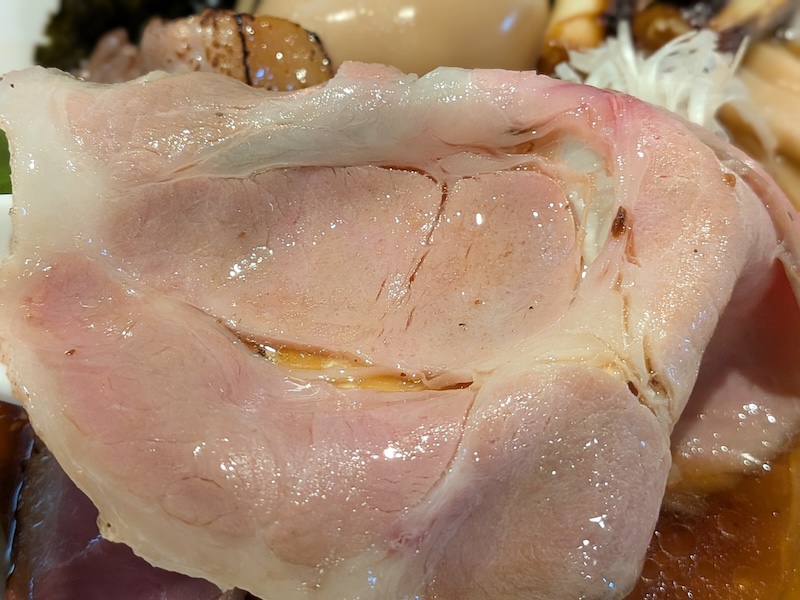 チャーシューはひと口噛み入れると繊維がほろほろとほどけ、鴨肉ならではの上品な脂の甘みと濃密な旨みがじわりと広がります。
