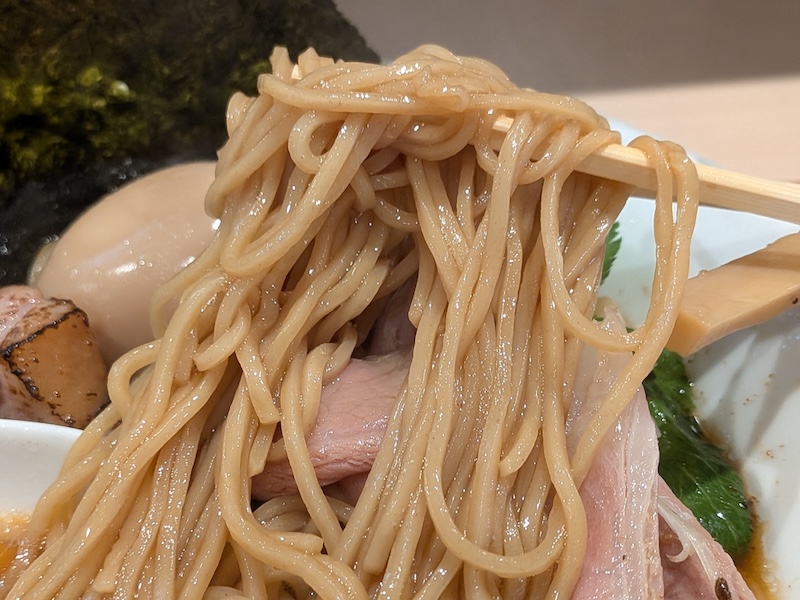 麺は角張った断面を持つ中細麺で、表面の滑らかさとシコシコとした弾力が絶妙に共存しています。スープをしっかりと纏いながらも、小麦本来の風味を主張する存在感があり、スープとの相性の良さは申し分ありませんでした。