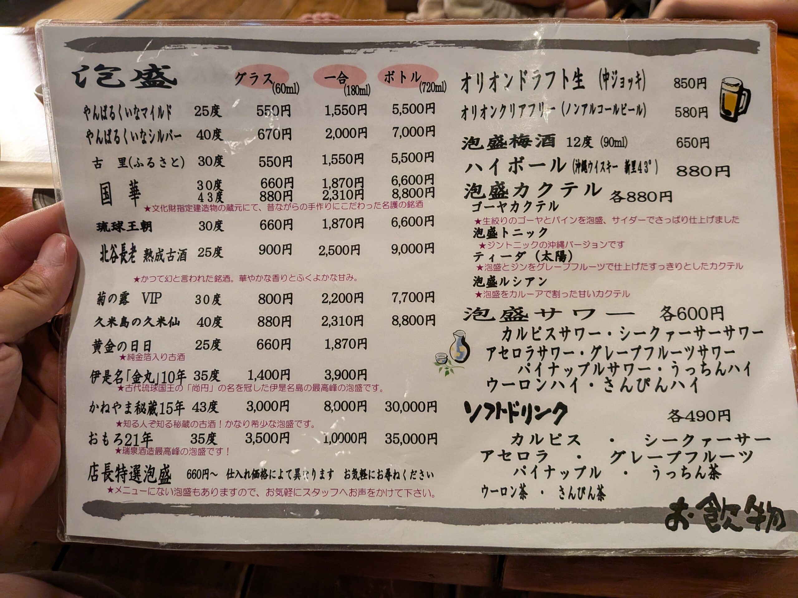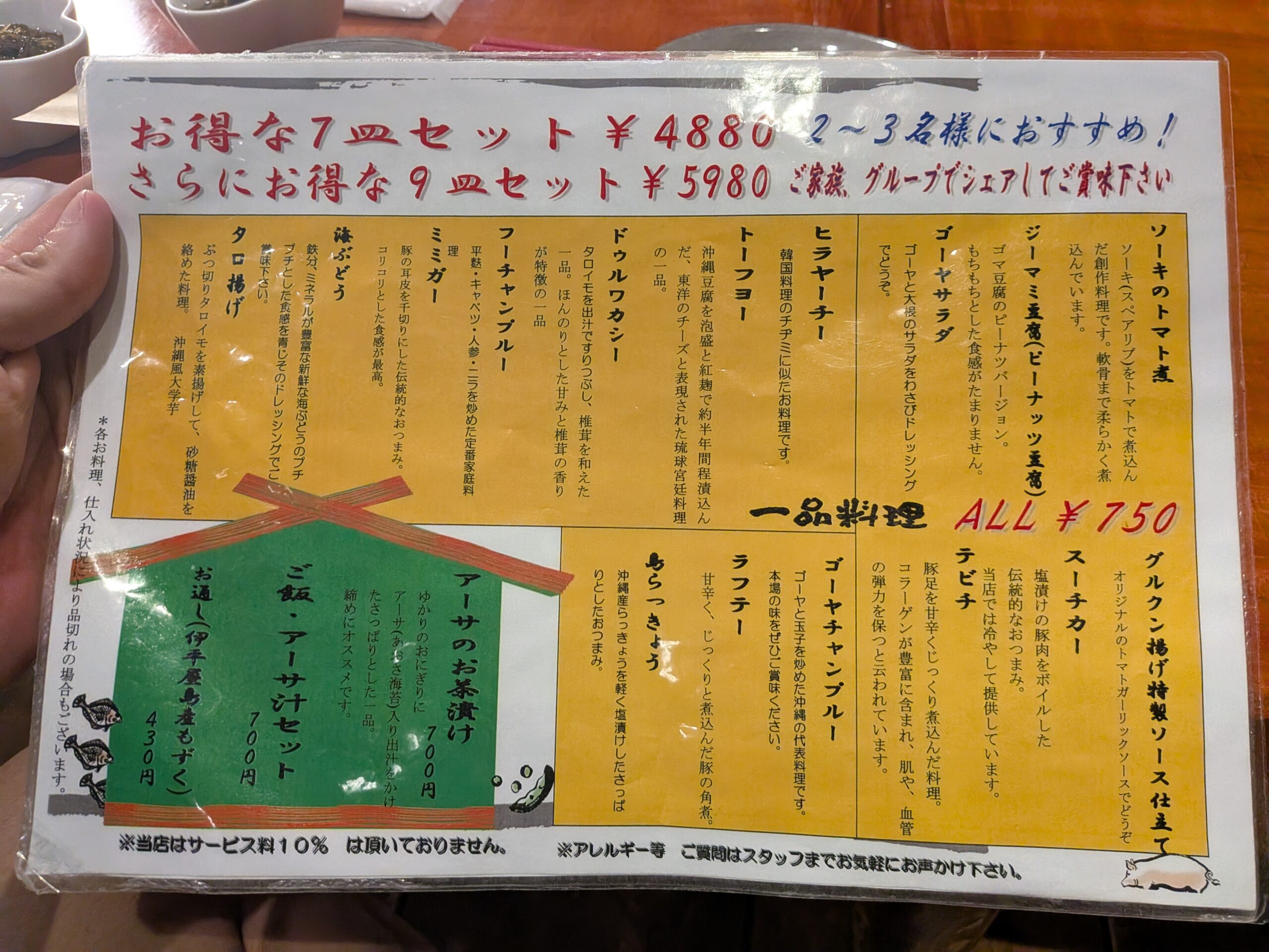 メニューは沖縄料理を中心に、単品料理(アラカルト)を注文してシェアする一般的な居酒屋スタイルです。