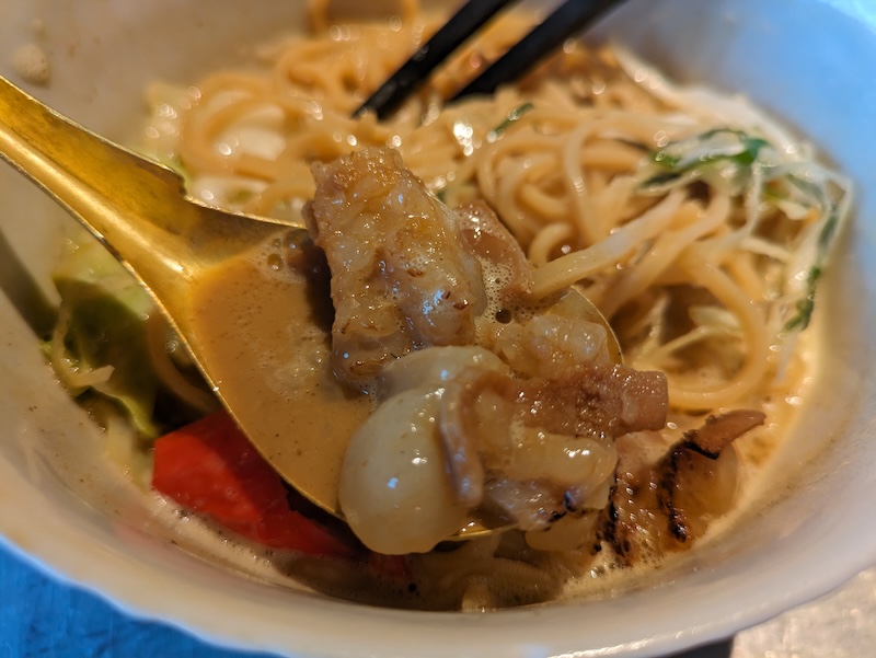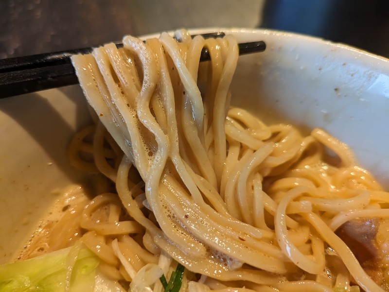 口に含んだ瞬間、鰹や昆布を思わせる和の出汁がやさしく広がり、すぐさま豚骨由来のコクと厚みが追いかけてきます。ベースは濃厚ながら、化学調味料を使用しないことで味に角がなく、飲み干したくなる清らかさがあります。どこまでも深く、それでいて重たすぎない。旨味の層が何段にも重なった、奥行きのある味わいでした。