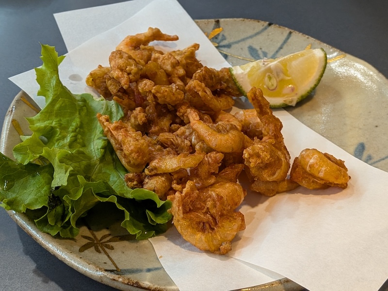 続くえびの唐揚げは、揚げたての衣がパリッと軽やかで、中のえびは驚くほどプリプリとした弾力に富んでいました。