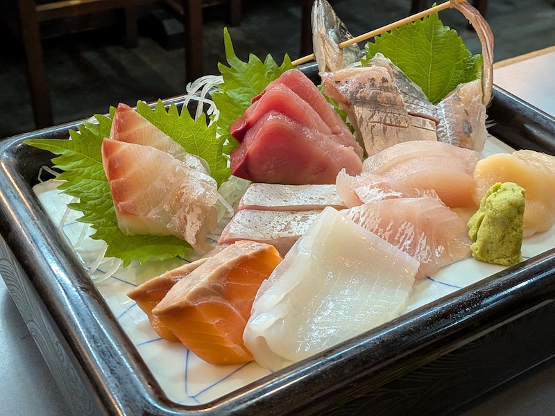 お造りの盛り合わせには、サーモン・アオリイカ・ホタテ・アジ・マグロと、伊勢湾の恵みが一皿に集結していました。