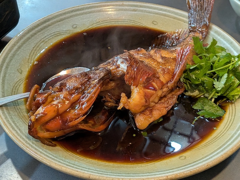 この夜の白眉ともいえる一品が、煮付けです。甘辛い醤油ベースのたれが、ふっくらと白く仕上がった身にしっかりと絡み、骨の際まで旨みを吸い込んでいます。