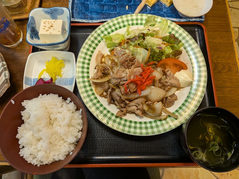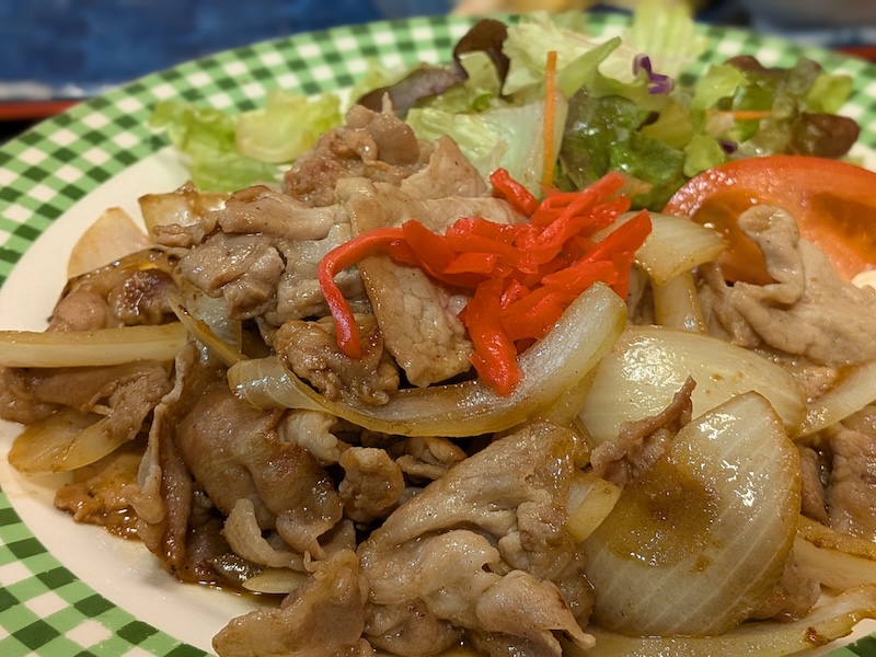豚の生姜焼きも、醤油ベースの甘辛いタレが豚肉と玉ねぎにしっかり絡み、生姜の香りが食欲をそそる一皿です。